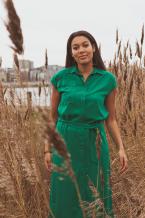 Dit speelse hemdjurkje kan gedragen worden naar elke gelegenheid. Je kan hem recht en los dragen of ingebonden met het afneembare lint in dezelfde stof. Zowel de mouwen als de kraag zijn hebben een fijne elegante afwerking. Hij is gemaakt uit liocel waardoor het comfortabel is om te dragen.