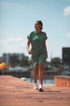 This playful dress has a flattering waterfall neckline, playful short sleeves and a detachable ribbon to tie around your waist. It is made of jersey tencel. Smooth and summery style that will give you the ultimate summer look!
