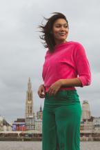 Deze sweater met ronde hals zit wat losser bij het bovenlichaam en sluit meer aan bij de mouwen(3/4)
