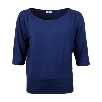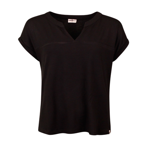 Deze T-shirt is gemaakt van 95% viscose en 5% elastaan, waardoor hij zacht, licht en rekbaar aanvoelt. Het heeft een losse pasvorm, een brede ronde hals en subtiele naden.